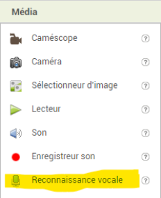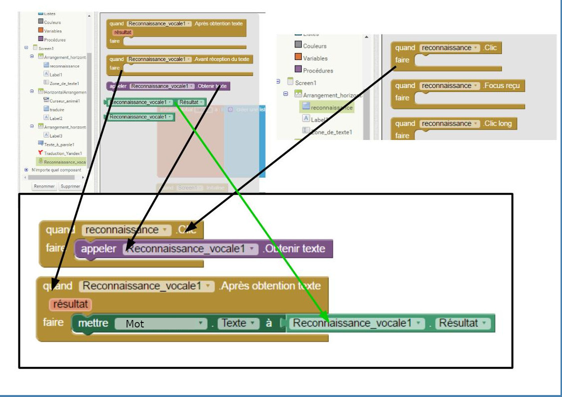 3 | Compléter la partie blocs : Algorithme : S'il y a un clic sur le bouton "reconnaissance " alors on appelle la reconnaissance vocale pour convertir la parole en texte. Lorsqu'on reçoit le texte de la reconnaissance vocale alors on vient l'écrire dans la zone de texte "mot" |
