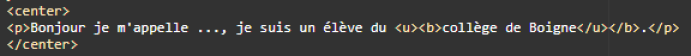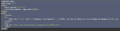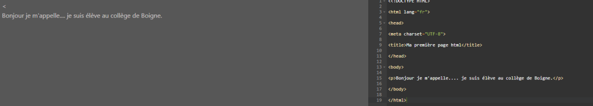 2 | Copier le texte ci-dessous : <!DOCTYPE HTML> <html lang="fr"> <head> <meta charset="UTF-8"> <title>Ma première page html</title> </head> <body> <p>Bonjour je m'appelle.... je suis un élève du collège de Boigne.</p> </body> </html> |