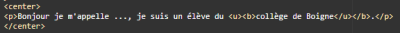 <p>Bonjour je m'appelle ..., je suis un élève du collège de Boigne.</p>
