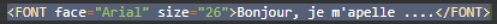 Ce qui nous donne si l'on veut modifier la police du texte "Bonjour je m'appelle ...." <FONT face="Arial" size="26">Bonjour, je m'apelle ....</FONT> | |