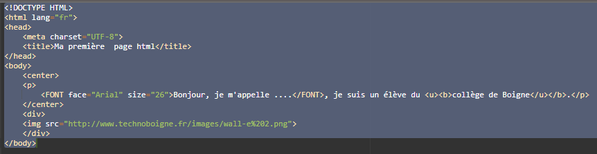 8 | Nous allons maintenant insérer l'image de Wall-e, logo du cours de technologie. Pour cela ajouter la ligne de commande suivante après la balise </center>: <div> <img src="http://www.technoboigne.fr/images/wall-e%202.png"> </div> | |