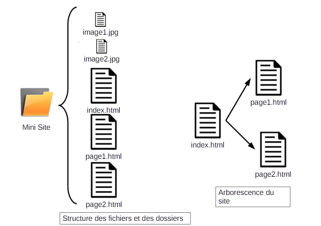 Arborescence du dossier (contenant le site) | 1 | 1 page (ou écran)= 1 fichier html | |