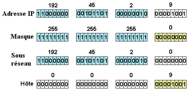 Le masque de sous réseau permet de séparer dans une adresse IP la partie réseau de la partie hôte (machine) de l'adresse | |