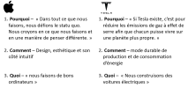 | 1 - Pourquoi : Ce sont les convictions fondamentales de votre projet. C'est pourquoi le projet existe. 2 - Comment : C'est comment le projet va satisfaire ces convictions fondamentales. 3 - Quoi : C'est ce que le projet va faire pour satisfaire les convictions fondamentales. | |