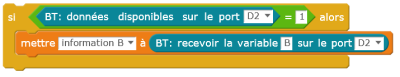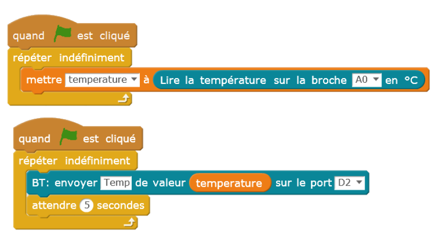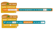 Bluetooth | Permet de communiquer par Bluetooth avec d'autres éléments. A brancher sur D2 | Vitesse de transfert 115200 bauds Si je reçois une donnée par bluetooth, j'affecte à la variable "information B", les données de la variable de communication B. Ceci permet de transmettre plusieurs informations en même temps et de les trier. Permet d'envoyer par BT toutes les 5 secondes la valeur de la température. La variable de transport est Temp (on aura les données suivantes Temp:20.... | ||