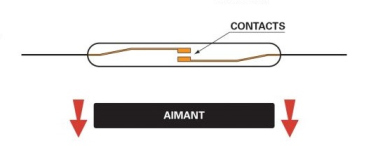 Crée un contact lorsque l'aimant est éloigné du contacteur. Permet par exemple de détecter l'ouverture d'une porte |