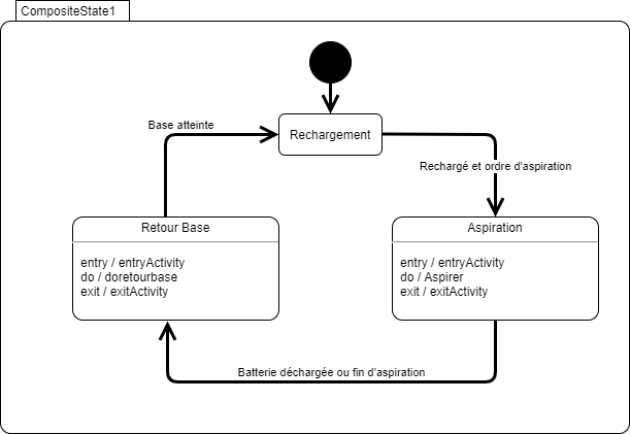 4 | Compléter compléter le diagramme d'état[1] de l'aspirateur tel que vous l'observez en vous aidant de l'outil connecteur. |