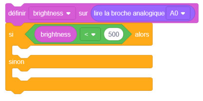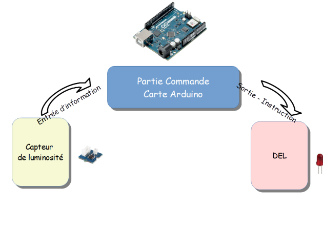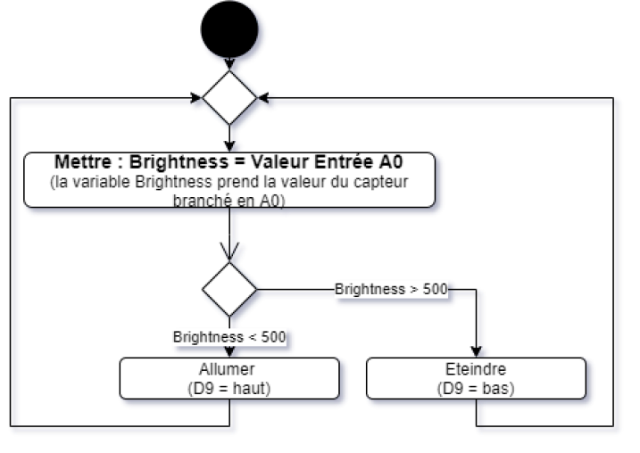 Algorithme du programme : . Le système doit se comporter de la façon suivante. On lit la valeur du capteur de luminosité branché sur l'entrée A0 Si cette valeur est inférieure à 500, alors on allume la diode branchée en D9 Sinon on éteint la diode. |