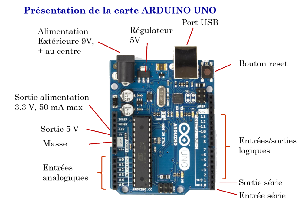 La carte Arduino est le contrôleur Principal de notre système. C'est le cerveau du système. Elle comporte des Entrées Analogiques où l'on vient brancher des capteurs Analogiques Des ports Numériques sur lesquels on vient brancher des Capteurs-Contacteur-Codeurs numériques et des Actionneurs commandés numériquement |