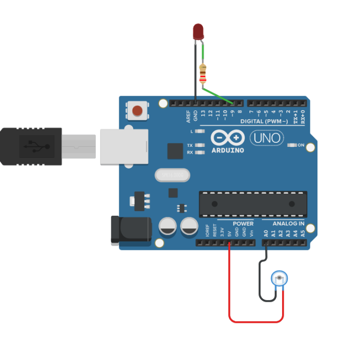 1 Capteur de luminosité ambiante | 1 Contacteur à brancher sur le port A0 de la carte arduino 1 Emetteur à brancher sur le 5V de la carte Arduino |