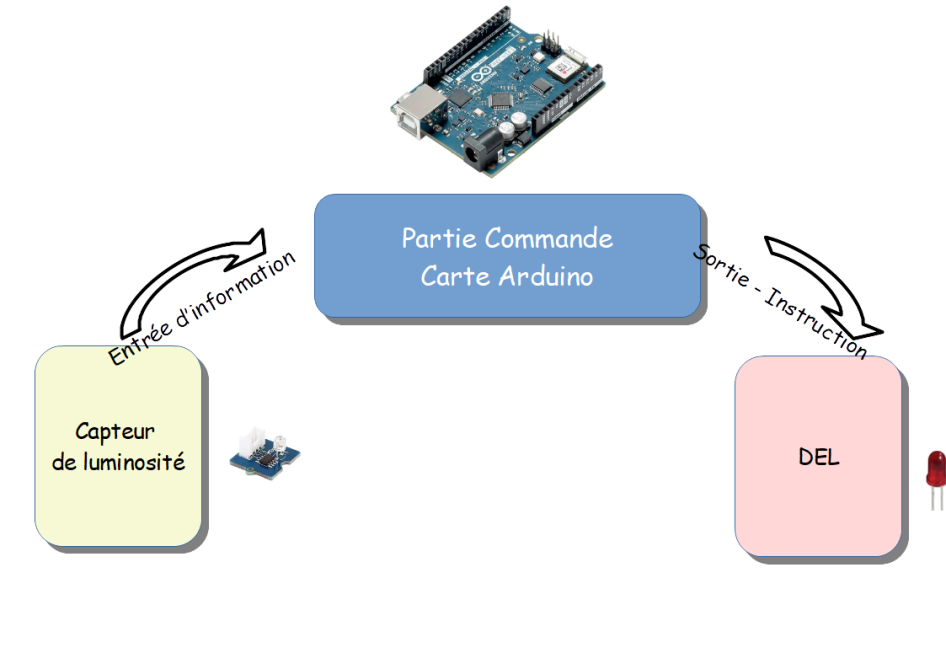 1 Led rouge et sa résistance de protection | 1 Actionneur à brancher sur le port D9 de la carte Arduino. Elle réalise une action. Elle se pilote grâce à une instruction qui sort de la carte Arduino |