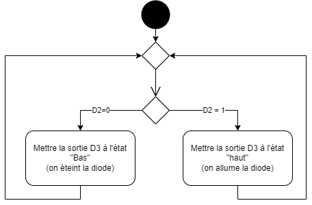 Concevoir un système constitué d'un bouton poussoir et d'une diode. Si j'appuie sur le bouton poussoir alors la diode s'allume Sinon elle s'éteint |