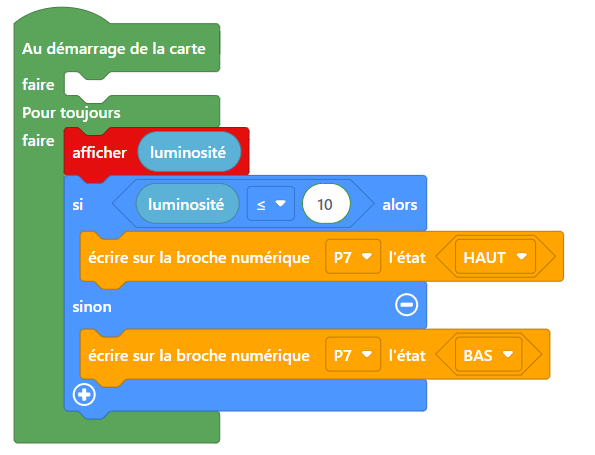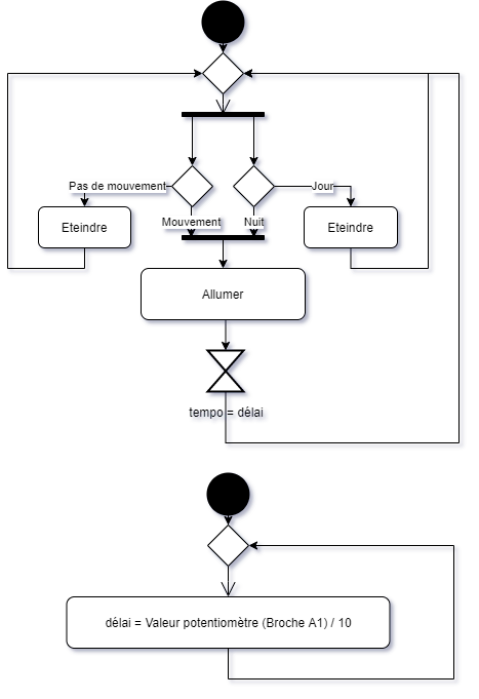L'objectif de cette partie est d'automatiser le fonctionnement de l'éclairage public. Si un objet est détecté et s'il fait nuit, alors la lumière s'allume. |