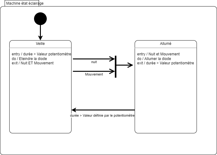 L'objectif de cette partie est d'ajouter un détecteur de mouvement au système. Le potentiomètre permet de faire varier la durée d'éclairement |