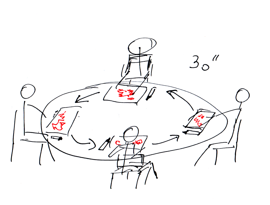 6 | Chaque élève du groupe a un stylo et une feuille de papier vierge. Une fois que tout le monde est prêt, commencer à dessiner une image. Une fois le temps de 30" écoulé, chacun passe ensuite sa feuille à la personne à sa droite pour continuer le dessin. Répétez le processus jusqu'à ce que chaque nouveau chef-d'œuvre revienne au propriétaire d'origine. Choisir pour le groupe une image à présenter au reste de la classe.