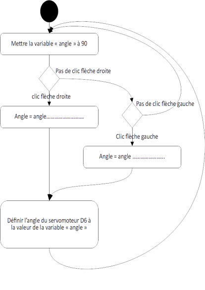 1.2 | Compléter le diagramme d'activité[1] que décrit l'algorithme Nous voulons créer un programme qui doit permettre au robot de : positionner son servomoteur à 90° ;