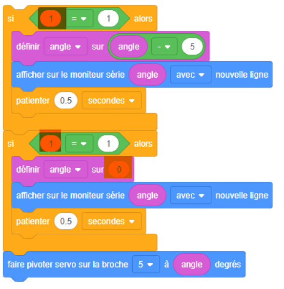 4.2 | - Modifier votre programme afin que la valeur de la variable angle soit comprise entre la valeur mini et la valeur maxi de rotation du servomoteur.
