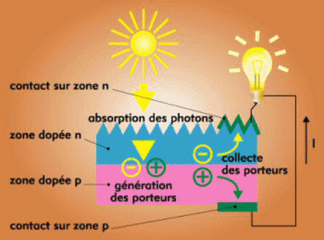 Lorsqu'un photon de la lumière arrive, son énergie crée une rupture entre un atome de silicium et un électron. La zone dopée n (silicium+phosphore) va libérer des électrons, qui vont circuler dans le fil et rejoindre la zone dopée p, qui libére sous l'effet de la lumière également des électrons qui traversent la zone neutre pour rejoindre les espaces laissés libres de la zone n.