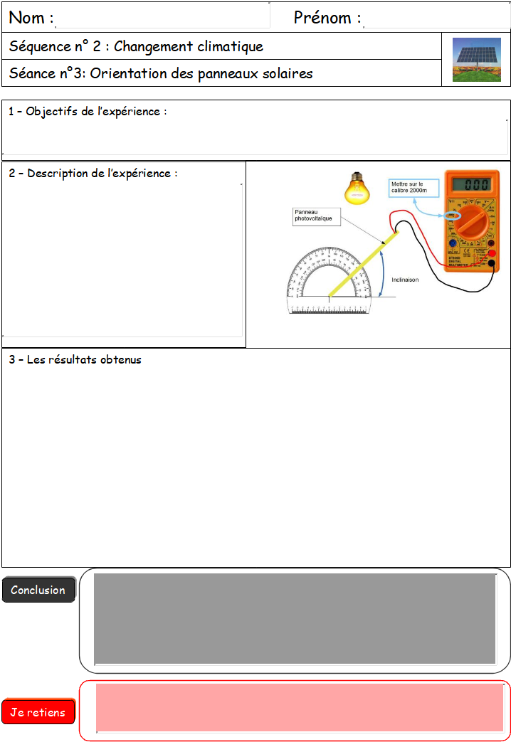 1 | Rechercher sur une feuille du classeur une expérience qui permettrait de déterminer le bon angle d'inclinaison des panneaux photovoltaïques. | |