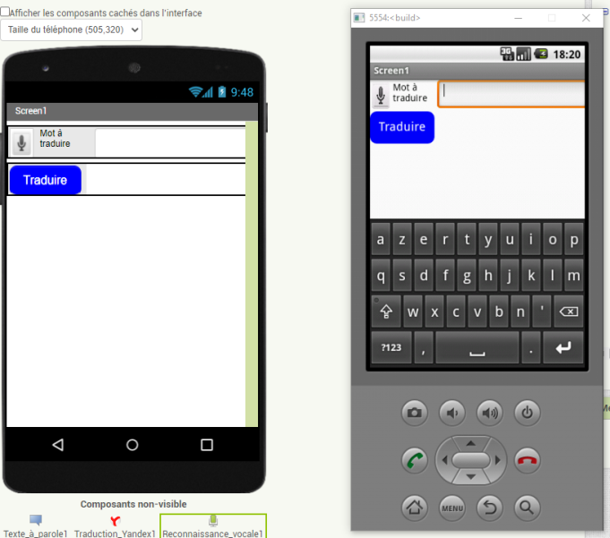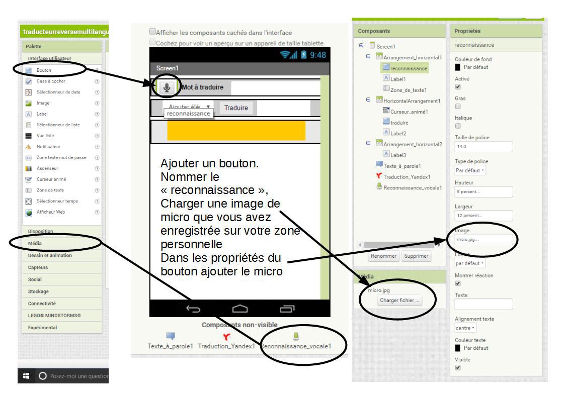 3 | Compléter la partie blocs : Algorithme : S'il y a un clic sur le bouton "reconnaissance " alors on appelle la reconnaissance vocale pour convertir la parole en texte. Lorsqu'on reçoit le texte de la reconnaissance vocale alors on vient l'écrire dans la zone de texte "mot" |